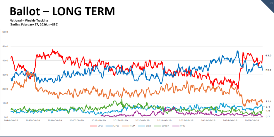 The random sample of 1,015 respondents may be weighted by age and gender using the latest census information for Canada. The interviews are compiled into a four week rolling average of 1,000 interviews, where each week the oldest group of 250 interviews is dropped and a new group of 250 interviews is added. Current data is for the four week period ending February 27, 2026.
