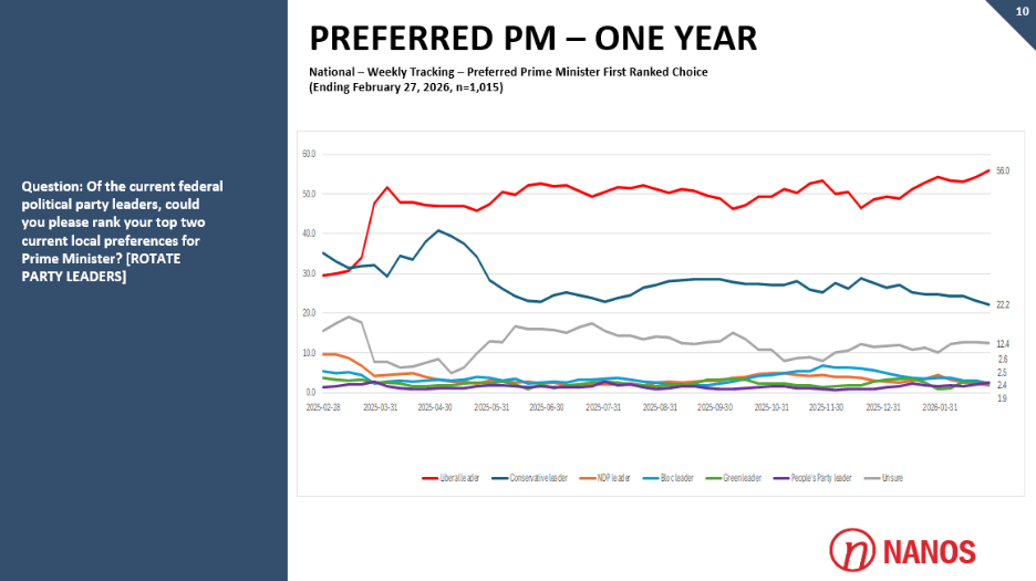 Preferred Prime Minister – Nanos tracking has Carney as the preferred choice as PM at 56.0 per cent of Canadians followed by Poilievre (22.2%), May (2.6%), Bernier (2.5%), Blanchet (2.4%), and Davies (1.9%). Twelve per cent of Canadians were unsure whom they preferred.